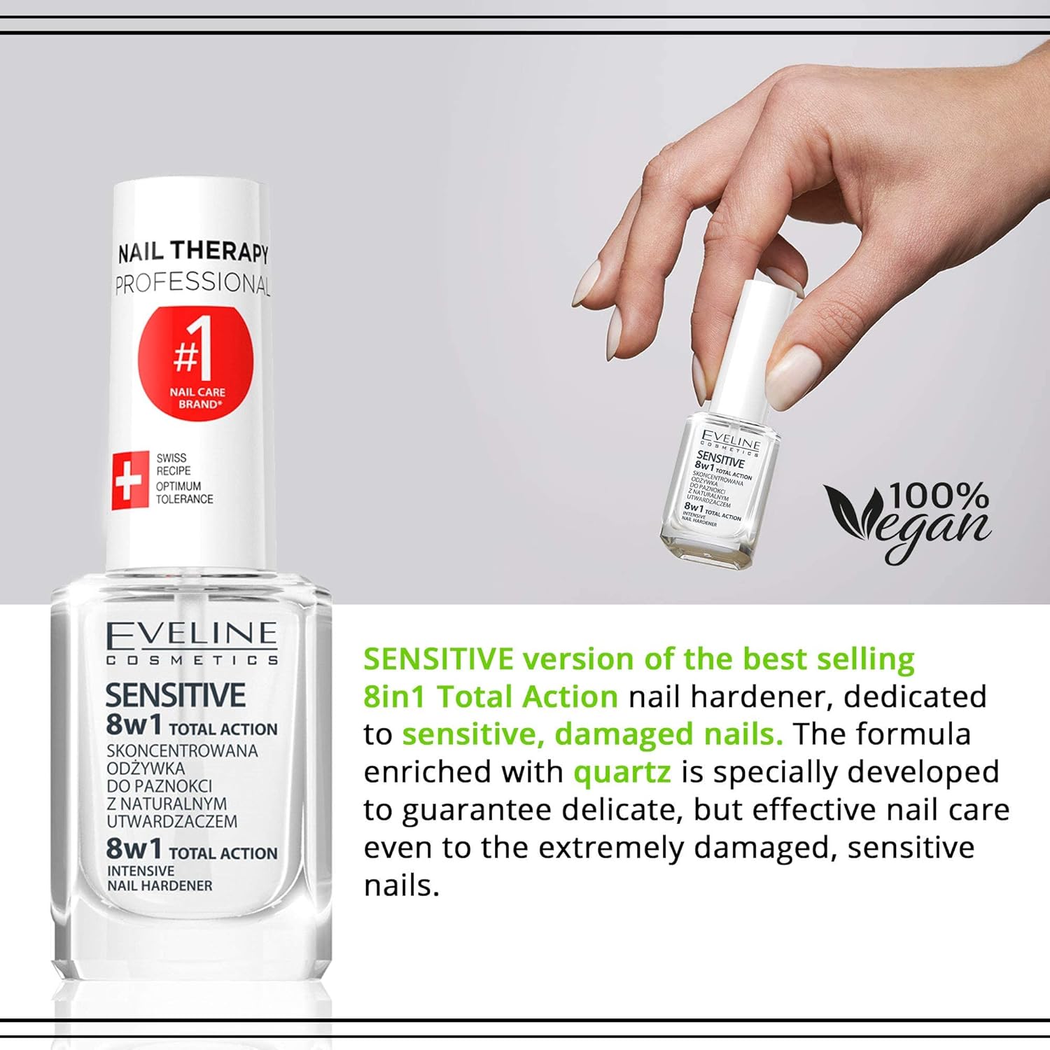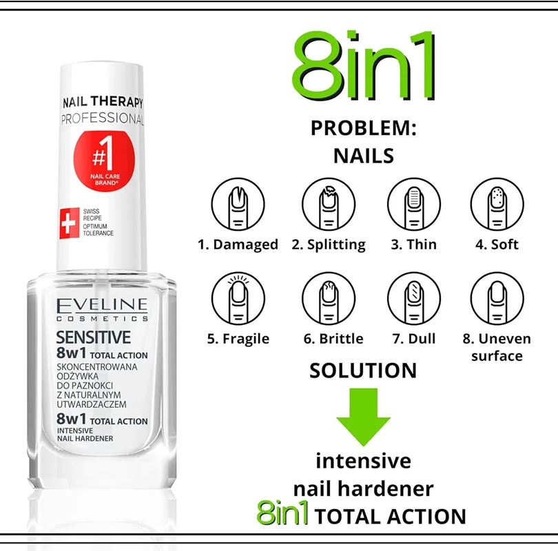 تقویت کننده 8 در 1 ناخن های حساس اولاین از برند محبوب Eveline Cosmetics، یک تقویتکننده چندمنظوره برای ناخنهای حساس، آسیبدیده و شکننده است. نسخه "Sensitive" آن بر پایه فرمول پرفروش 8in1 Total Action ساخته شده، اما با غنیسازی کوارتز (quartz) برای مراقبت ملایمتر و مؤثرتر طراحی شده است. این محصول به عنوان یک درمان فشرده عمل میکند و برای افرادی که ناخنهای ضعیف، حساس یا حساس به مواد شیمیایی مانند فرمالدئید دارند، ایدهآل است. حجم آن 12 میلیلیتر است و بدون تست حیوانی (cruelty-free) تولید میشود.