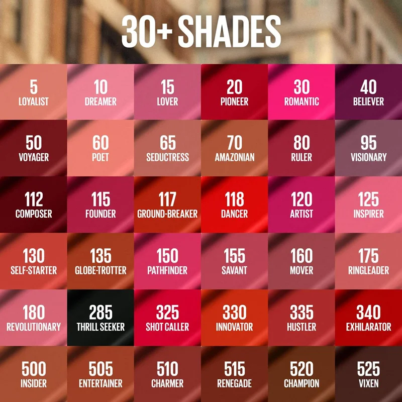 - تنوع رنگی گسترده: Maybelline Super Stay Matte Ink در طیف وسیعی از رنگها، از نودهای روزمره تا رنگهای جسورانه و تیره، عرضه میشود.