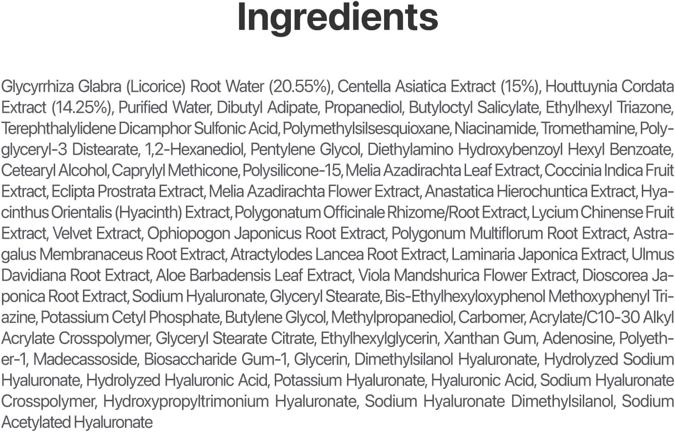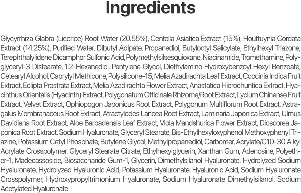 | Houttuynia Cordata Extract (Heartleaf) | ۱۴.۲۵% | خنککننده، ضدباکتری، تسکیندهنده تحریکات، کنترل چربی |